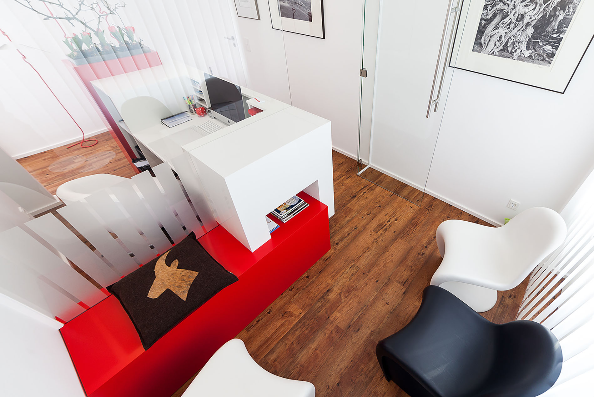 Diese Praxis begrüßt seine Patienten farbenfroh: die knallrote Anmeldetheke wird mit einem natürlich anmutenden Holzboden kombiniert. Ein besonderer Hingucker ist die, als rote, seilartig Konstruktion anmutende, Garderobe.